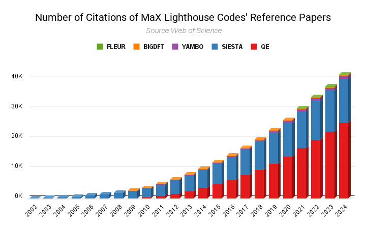 Total number of citations of reference papers of the MaX lighthouse codes.