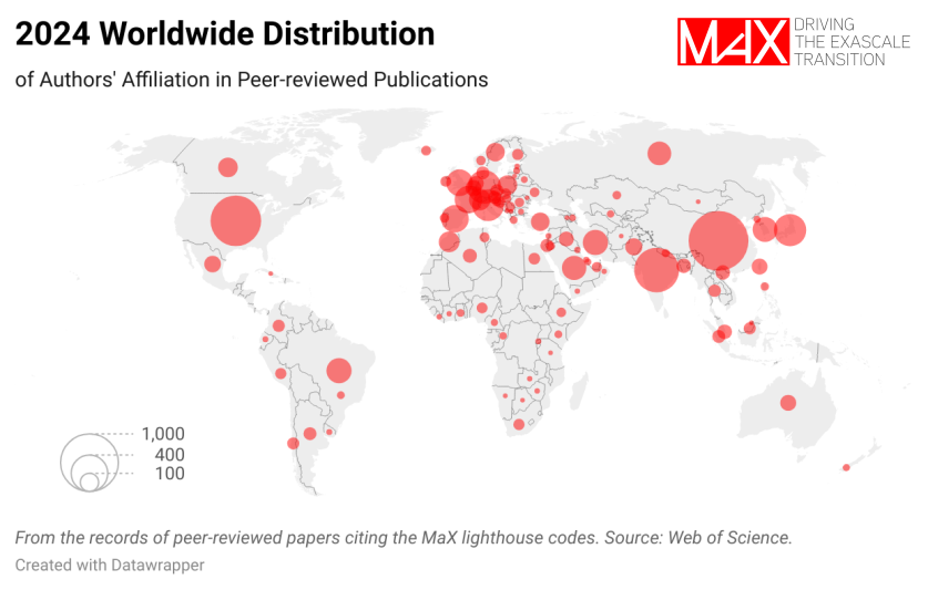 The impact of the MaX lighthouse codes within the scientific community can be effectively visualized through the maps collected in this section. In these maps, there are reported records of peer-reviewed papers citing the MaX lighthouse codes, divided by country both worldwide and in Europe. In the case of multiple authors from the same countries, the publication is counted once for each country.