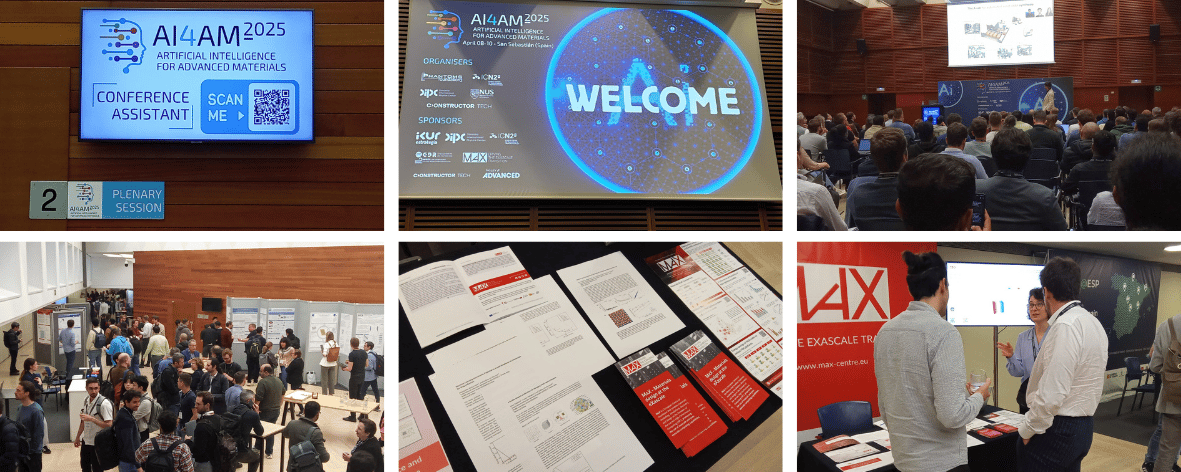 MaX Centre of Excellence was proud to be a Silver Sponsor of the Artificial Intelligence for Advanced Materials 2025 (AI4AM2025) conference, which took place from 8 to 10 April 2025 in San Sebastián, Spain. This international event brought together leading experts from industry and academia who are leveraging Artificial Intelligence (AI) to enhance materials research and innovation.